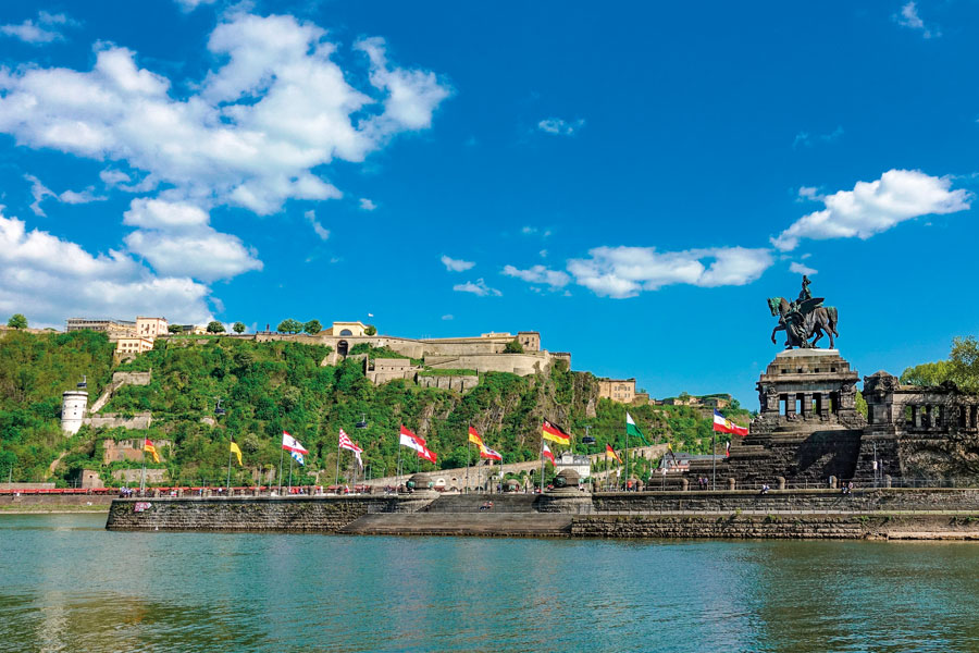 Hele formiddagen kan vi nyde synet af de stejle skiferklipper, vinmarker, borge og bindingsværksbyer langs med Rhinens bugtede løb. Ved Koblenz runder vi ”Det tyske Hjørne” (Deutsches Eck, Unesco-arv) og drejer ind på Moselfloden, hvor vi lægger til i den lille vinby Alken, hvis historie går tilbage til romertiden. Her bliver der tid til at nyde livet langs floden i den hyggelige by og eventuelt besøge den særprægede ”dobbeltborg” Thurant, der fra sin klippetop stolt våger over byen. Borgen er en af de ældste langs Mosel og alene udsigten ned over floden og dalen er hele besøget værd.