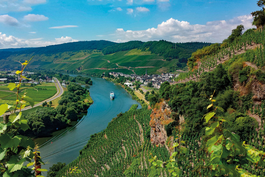 Formiddagens sejlads byder på den smukkeste del af Moselflodens løb forbi stejle vinmarker og charmerende små byer. Klimaet i Moseldalen er mildt og fra skibets soldæk har vi den dejligste udsigt. Vi passerer 5 sluser på vores vej til vinbyen Zell, der er verdensberømt pga. historien om ”Zeller Schwarze Katz” og hvidvinen af samme navn. Vi fortsætter sejladsen gennem de maleriske landskaber og ankommer sidst på eftermiddagen til endnu en betagende vinby, nemlig Traben-Trarbach. Den er egentlig to byer, som ligger på hver sin side af floden, men de blev forenet, da en bro blev bygget i 1898. Der bliver tid til at gå på opdagelse i dobbeltbyen og måske nyde et glas kølig moselvin på en af byens hyggelige beværtninger.