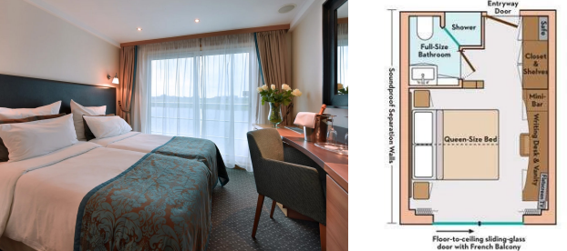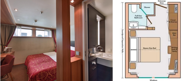 De er alle udvendige og med vinduer. Kahytterne har eget bad og wc. Der findes stol og skrivebord. Ligeledes er der aircondition og fladskærms tv.