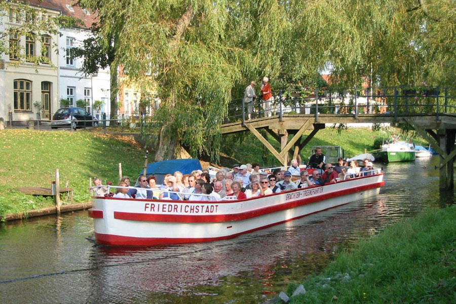 Der køres mod Friedrichstadt, med en lille pause undervejs, hvor vi får kaffe med rundstykke fra bussen. At besøge Friedrichstadt er som at komme ind i en lille hyggelig hollandsk landsby. Den charmerende arkitektur har klare paralleller til det mindre naboland Holland i form af gavlhuse og kanaler. Byens kanalsystem blev designet af nederlandske ingeniører og blev brugt til handel og transport. Friedrichstadt er kendt for sin arkitektur, der er inspireret af hollandsk renæssancestil. Nogle af de bemærkelsesværdige seværdigheder omfatter Marktplatz (torvet) samt en række smukke broer. Vi starter vores besøg med en hyggelig ”Grachtenfahrt” (kanalrundfart). Vi skal sejle en tur rundt i byens hyggelige kanaler, hvor mange huse har have eller terrasse ud til kanalerne. Efter sejlturen nyder vi en 2-retters menu på en af de lokale restauranter. Efter middagen bliver der lidt tid på egen hånd til at slentre i de hyggelige gader og til at beundre den hyggelige hollandsk inspirerede by. Byen regnes for den mest idylliske i hele Schleswig - Holstein. Hen ad eftermiddagen køres mod Danmark. På hjemturen holdes en lille pause, hvor vi får en sandwich med sødt samt kaffe ved bussen.