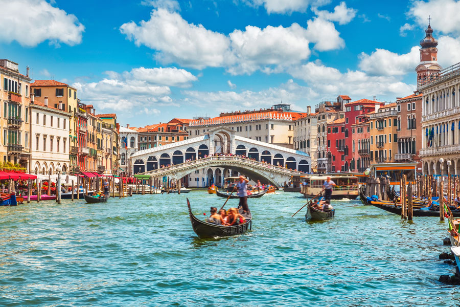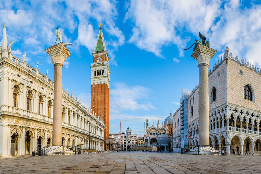 Den verdenskendte by er helt unik. Vi sejler ad Canale Grande til Markuspladsen, der har ord for at være den smukkeste plads i verden. Her ligger Markuskirken med det store klokketårn, Campanilen samt Sukkenes Bro. Dogepaladset, som nok er en af de mest ejendommelige bygninger i verden, ligger ligeledes her. Vi holder en længere pause, så der bliver mulighed for at opleve den smukke by på egen hånd.