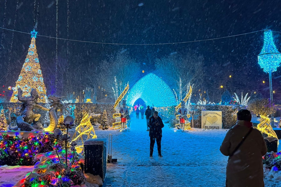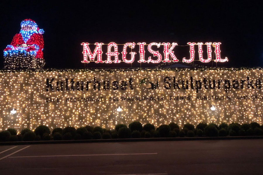 Vi fortsætter til Skulpturparken Blokhus, hvor vi skal opleve magien og den eventyrlige julestemning, når de enorme sandskulpturer oplyses og den 20.000 m2 store skulpturpark som igen byder på en eventyrlig oplevelse, hvor parkens bygninger, træer og haver er pyntet i et strålehav af tusindvis af lysdekorationer og mere end 2 million julelys.