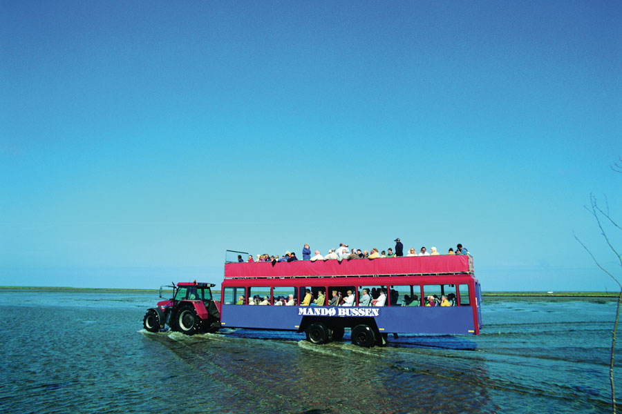 Vi kører sydpå og finder et passende sted, hvor vi får kaffe og et rundstykke fra bussen. Turen fortsætter forbi Ribe og derfra til Vester Vedsted. Her skal vi med Mandøbussen. Turen varer ca. 45 min. Mandøbussen kører igennem Danmarks største Nationalpark Vadehavet. Hvert forår og efterår er der besøg af ca. 10 millioner vadefuglearter, som er på træk. Disse fugle benytter Vadehavet som rasteplads på deres lange rejse, fra de kolde områder i nord, til de varme ynglepladser i syd. Nationalparken rummer mere end 30 små øer. Mandø er beboet med 31 indbyggere.